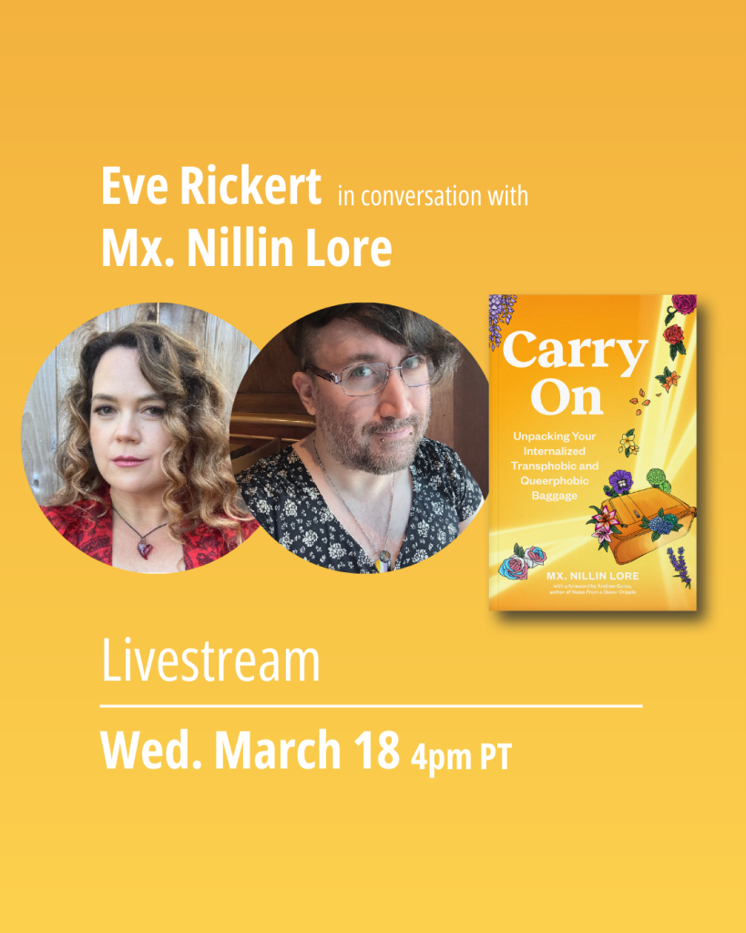 Hello all! We’re just 15-days away from the official release of Carry On: Unpacking Your Internalized Transphobic and Queerphobic Baggage, which means it’s time for a bunch of appearances, reading, and launch events! This upcoming March 18th will be my first major appearance to promote the book as I join Eve Rickert from Thornapple Press over a YouTube livestream at 4:00 PM PT / 2:00 PM CST.